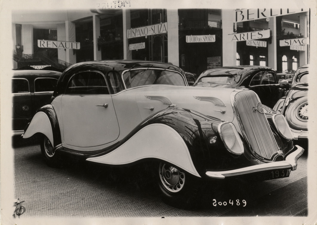 View of 1937 Panhard car at 1936 Salon de l'Automobile. Typed on back: "Paris. Salon de l'Automobile. Voiture Panhard et Levassor, I4 C.V., aerodynamique, conduite centrale. Photo ROL. le 1.10.36. 200.489." Stamped on back: "Agence ROL, Agence Francaise fondee en 1905. 4, rue Richer, Paris (IXe). Telephone Provence: 27-77. Adresse telegraphique: Photorocie-Paris. La mention Photo ROL est obligatoire. Epreuve sur papier 'As de Trefle.'"