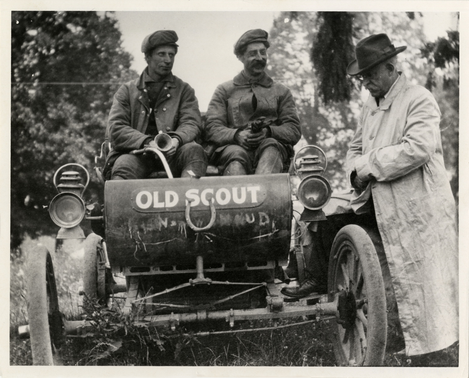 View of driver and passenger in 1903 "Old Scout" Oldsmobile car. Man wearing trench coat and hat stands next to car. "Old Scout" painted on front of car; horseshow is affixed to front of car. Stamped on back: "Photography by Leavenworth Commercial Studios, Lansing, Michigan." Typed on back: "Oldsmobile, 1903 (Old Scout & Steady)."
