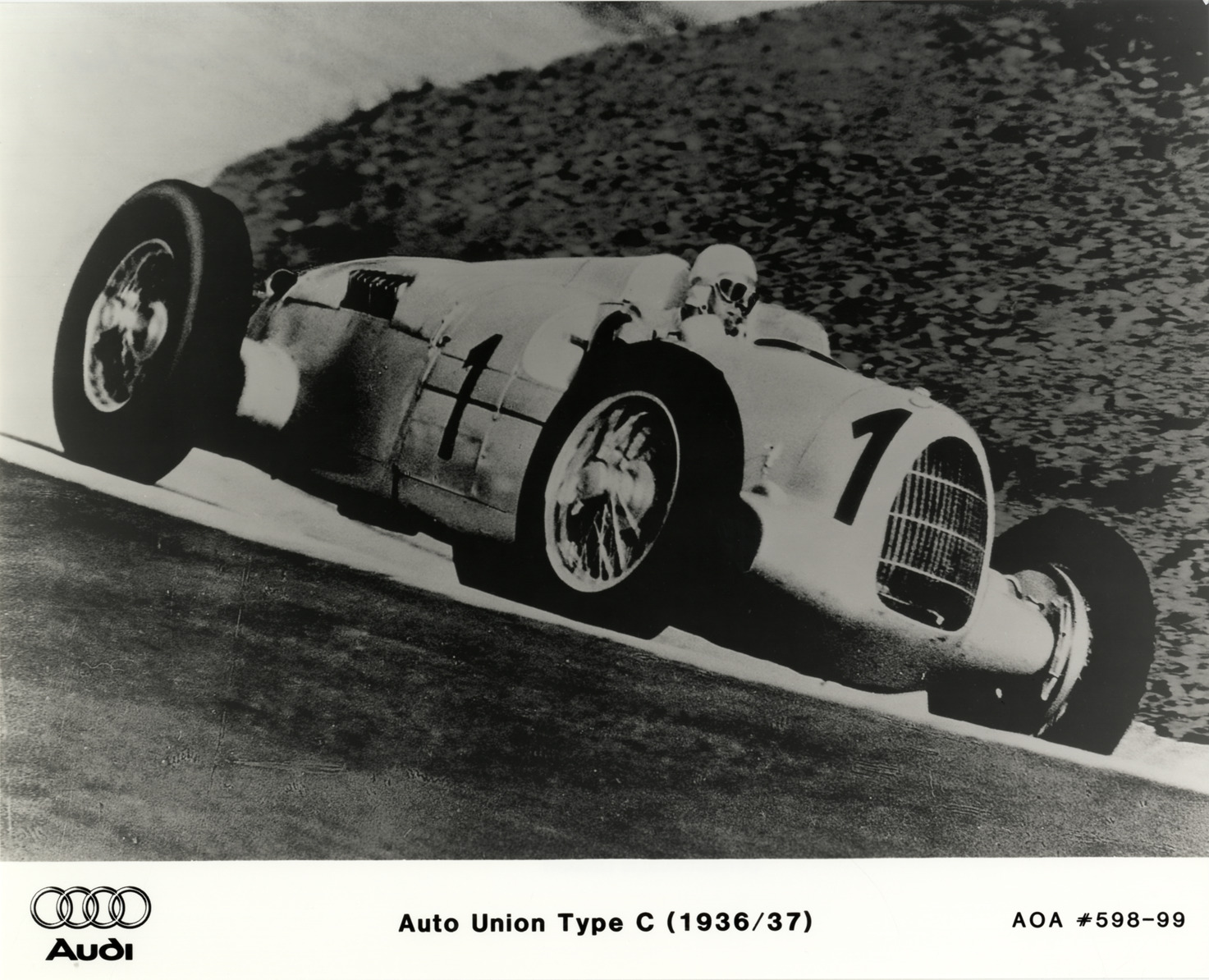 Favorite this☆ 1936-1937 Audi Auto Union Type C racecar Description: View of 1936-1937 Audi Auto Union Type C racing car no. 1. Printed on front: "Audi, Auto Union Type C (1936/37), AOA #598-99." Details Resource ID: na020167 Subject: Automobiles, Racing Audi automobile Photographic prints Date Issued: Unknown year Format: 1 photographic print ; 8 x 10 in. Member of: National Automotive History Collection Filing Location: Racing cars-Audi Rights: Physical rights are retained by DPL. Copyright is retained in accordance with U.S. copyright laws.