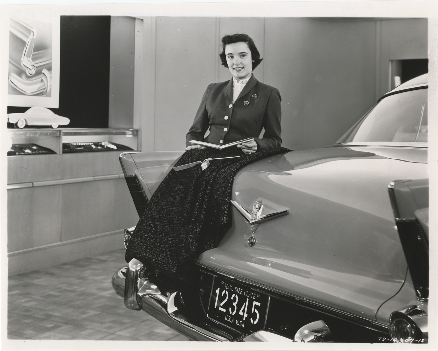 View of Carol Burkheiser of Plymouth's styling department, displaying interior upholstery fabric over rear of 1956 Plymouth car. Burkheiser holds a "V" emblem for the trunk lid. Typed on back: "Paralleling the styling development work on body exteriors, interior stylists are hard at work on car appointments--new fabric patterns are created, supplier mills and consulted on their production, instrument panels ar designed and color combinations worked out. As soon as inside body dimensions have been finalized after tryouts on the 'seating buck' (wood replica of car's interior), shapes of seats, arm rests, etc., and their trim treatments are worked out. Carol Burkheiser of the styling department is shown with a new interior upholstery fabric featuring metallic threads interwoven through a dark rayon-cotton background. She holds one of several proposed "V" emblems for 1956 Plymouth trunk lid. Final version is mounted on plastic full-scale 'mock-up' in foreground." Handwritten on back: "Plymouth, design, 1956."