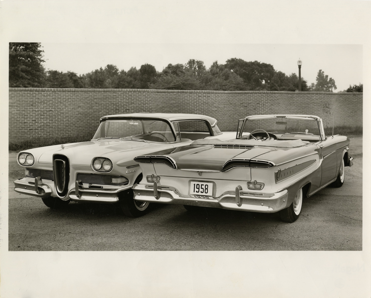 View of two 1958 Edsel Citation cars. Typed on back: "Two Edsels, a Citation two door hardtop and a Citation convertible, dramatically illustrate the new styling concepts that make these the most distinctive and easily recognizable medium price cars on the road. The Edsel's tailored elegance begins with the vertical grille, dual headlights and wraparound turn indicators. A single chrome side spear stops just short of the concave sculptured 'teardrop' side scallop which, in turn, blends into the horizontal tailights. All 18 models of the Edsel in the four series -- Ranger, Pacer, Corsair and Citation -- will be available for public inspection in dealer showrooms beginning Sept. 4. Public Relations Department, Edsel Division, Ford Motor Company, Dearborn, Michigan." Handwritten on back: "Edsel, 1958. Citation."