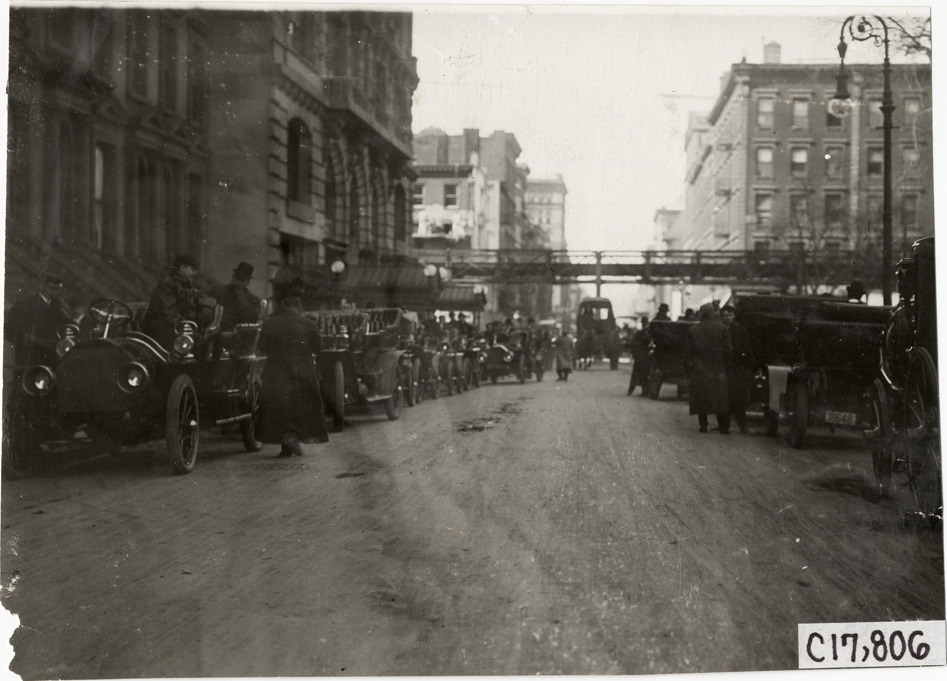 Automobiles parked on street, 1907 Chicago Reliability Run