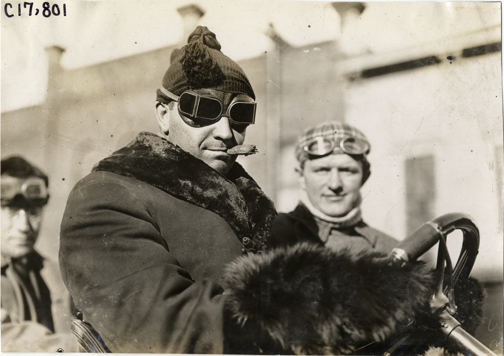Close-up view of driver Barney Oldfield, wearing goggles, knit hat and smoking a cigar, in car during 1907 Reliability Contest sponsored by the Chicago Motor Club. Participants traveled routes through Illinois and Indiana. Handwritten on back: "Barney Oldfield in 1907. Tours--Chicago Reliability Run, 1907."