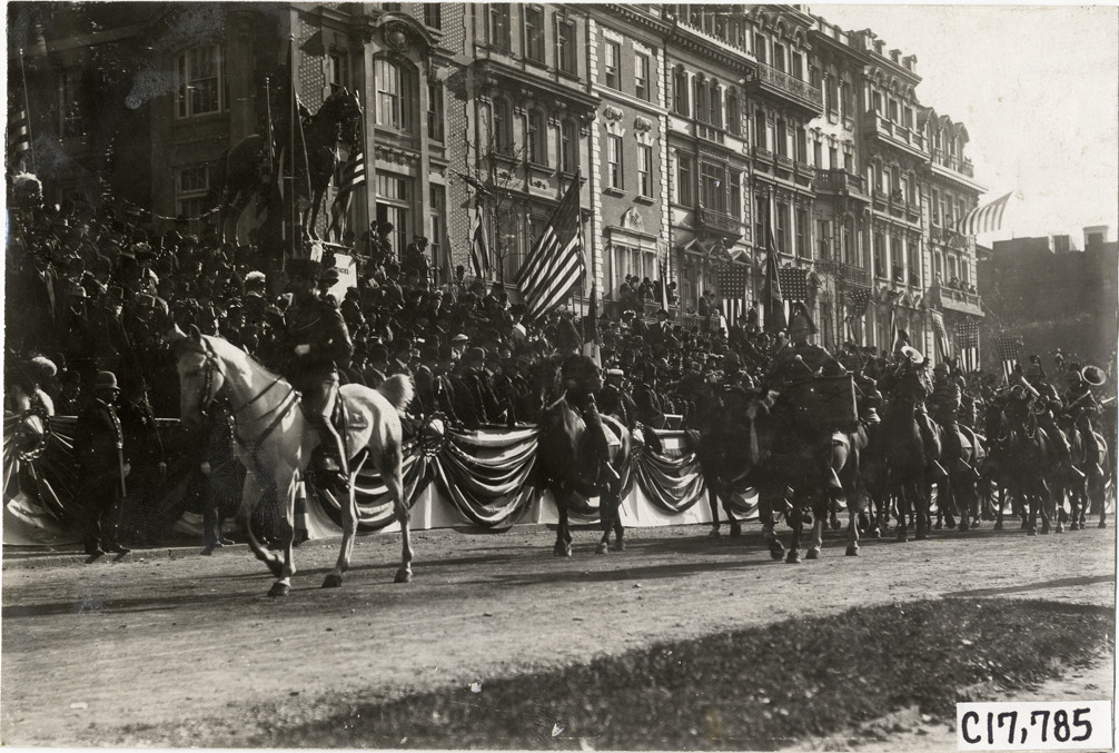 Band on horseback passing in front of grandstand, 1907 Chicago Reliability Run