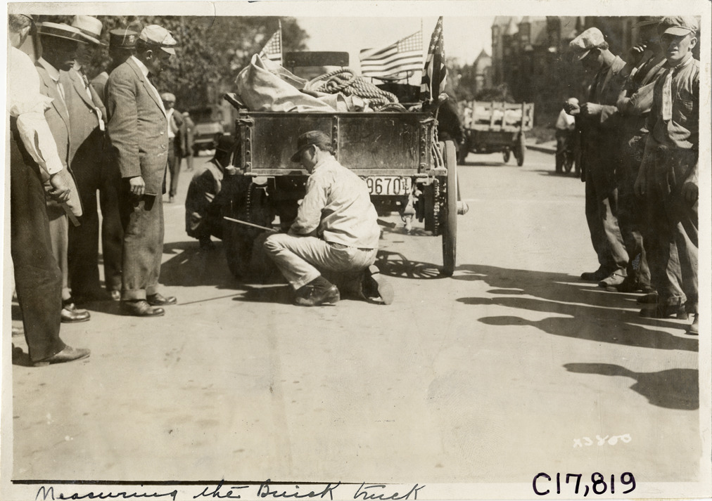 View of man measuring rear of Buick truck during 1911 reliability contest sponsored by the Chicago Motor Club. Contestants traveled on routes through Illinois, Indiana, Kentucky, Ohio and Michigan. Handwritten on front: "Measuring the Buick truck." Stamped on back: "Spooner & Wells, Inc., photographers, 1231 Woodward Ave., Detroit, Mich., telephone North 1745." Handwritten on back: "Measuring the Buick [undecipherable] carefully. Tours--Chicago Reliability Run, 1911."