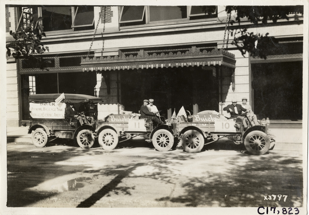 View of motorists in three Buick trucks parked in front of commercial building during 1911 reliability contest sponsored by the Chicago Motor Club. Contestants traveled on routes through Illinois, Indiana, Kentucky, Ohio and Michigan. Sign on truck in rear reads: "Buick, official baggage truck, Chicago Evening American." Stamped on back: "Spooner & Wells, Inc., photographers, 1231 Woodward Ave., Detroit, Mich., telephone North 1745." Handwritten on back: "Tours--Chicago Reliability Run, 1911."