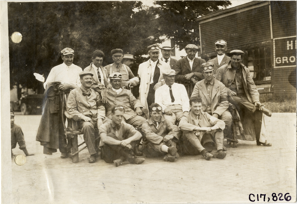 Group portrait of officials at Fort Wayne, Indiana during 1911 reliability contest sponsored by the Chicago Motor Club. Contestants traveled on routes through Illinois, Indiana, Kentucky, Ohio and Michigan. Stamped on back: "Spooner & Wells, Inc., photographers, 1231 Woodward Ave., Detroit, Mich., telephone North 1745." Handwritten on back: "The officials taken at Ft. Wayne, Ind. Tours--Chicago Reliability Run, 1911."