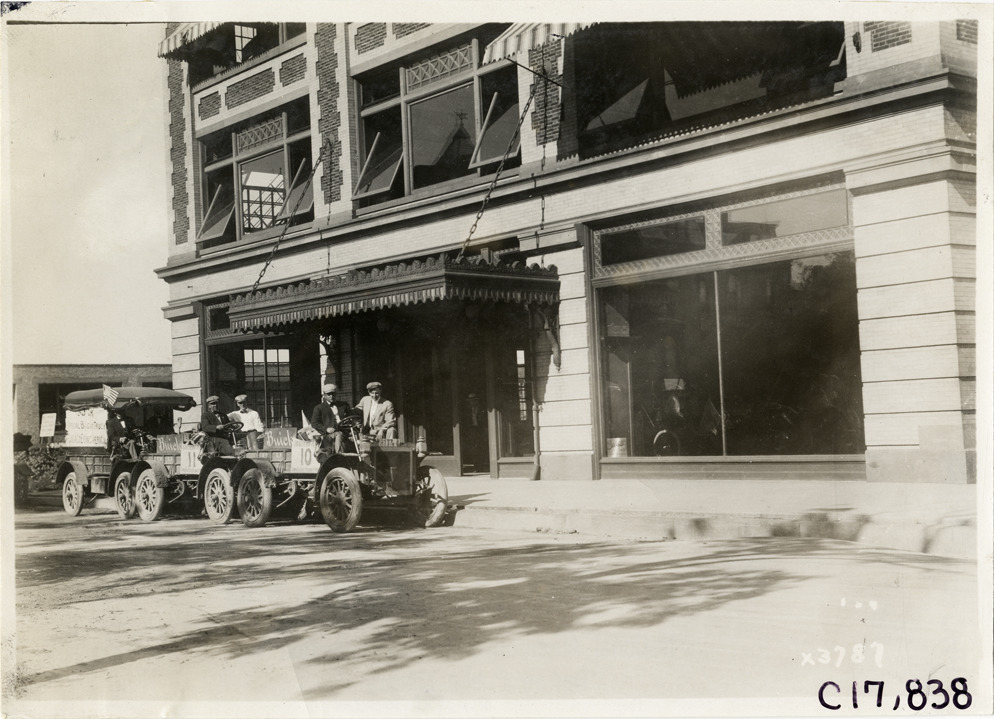 Buick trucks parked in front of commercial building, 1911 Chicago Reliability Run