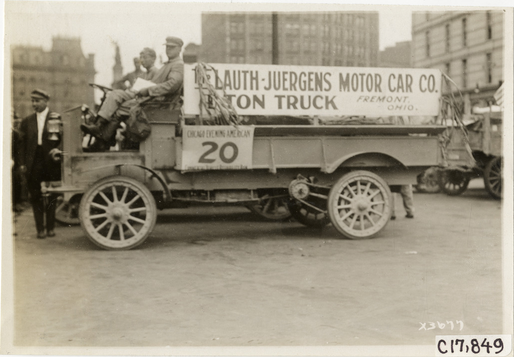 View of driver and passenger in McLauth-Juergens truck no. 20 during the 1911 reliability contest sponsored by the Chicago Motor Club. Contestants traveled on routes through Illinois, Indiana, Kentucky, Ohio and Michigan. Sign on truck reads: "McLauth-Juergens Motor Car Co. 1 ton truck, Fremont, Ohio." Stamped on back: "Spooner & Wells, Inc., photographers, 1231 Woodward Ave., Detroit, Mich., telephone North 1745." Handwritten on back: "Tours--Chicago Reliability Run, 1911."