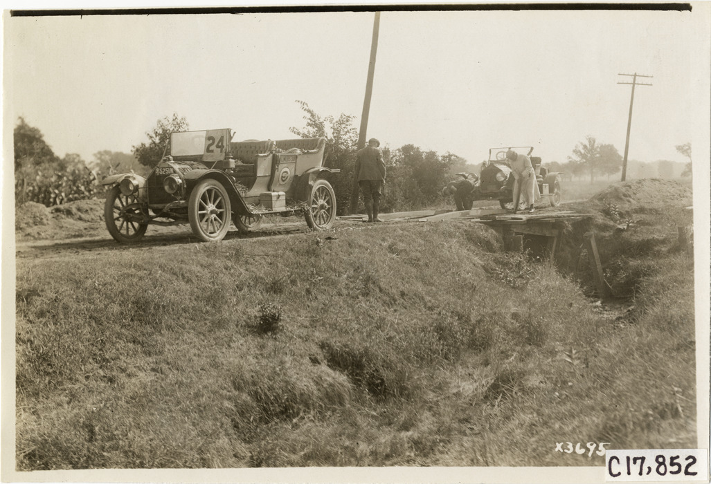 View of motorists with Chalmers-Detroit "30" car no. 24 and second car at wooden bridge over creek during 1911 reliability contest sponsored by the Chicago Motor Club. Two men attempt to guide tires of second car over bridge. Contestants traveled on routes through Illinois, Indiana, Kentucky, Ohio and Michigan. Stamped on back: "Spooner & Wells, Inc., photographers, 1231 Woodward Ave., Detroit, Mich., telephone North 1745." Handwritten on back: "Tours--Chicago Reliability Run, 1911."