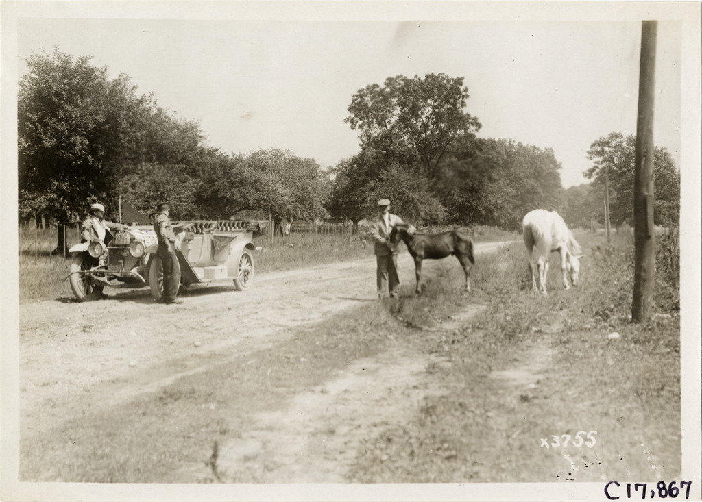 View of motorists with car on rural roadside during the 1911 reliability contest sponsored by the Chicago Motor Club. Man stands with foal and horse on opposite side of road. Contestants traveled on routes through Illinois, Indiana, Kentucky, Ohio and Michigan. Stamped on back: "Spooner & Wells, Inc., photographers, 1231 Woodward Ave., Detroit, Mich., telephone North 1745." Handwritten on back: "Tours--Chicago Reliability Run, 1911."