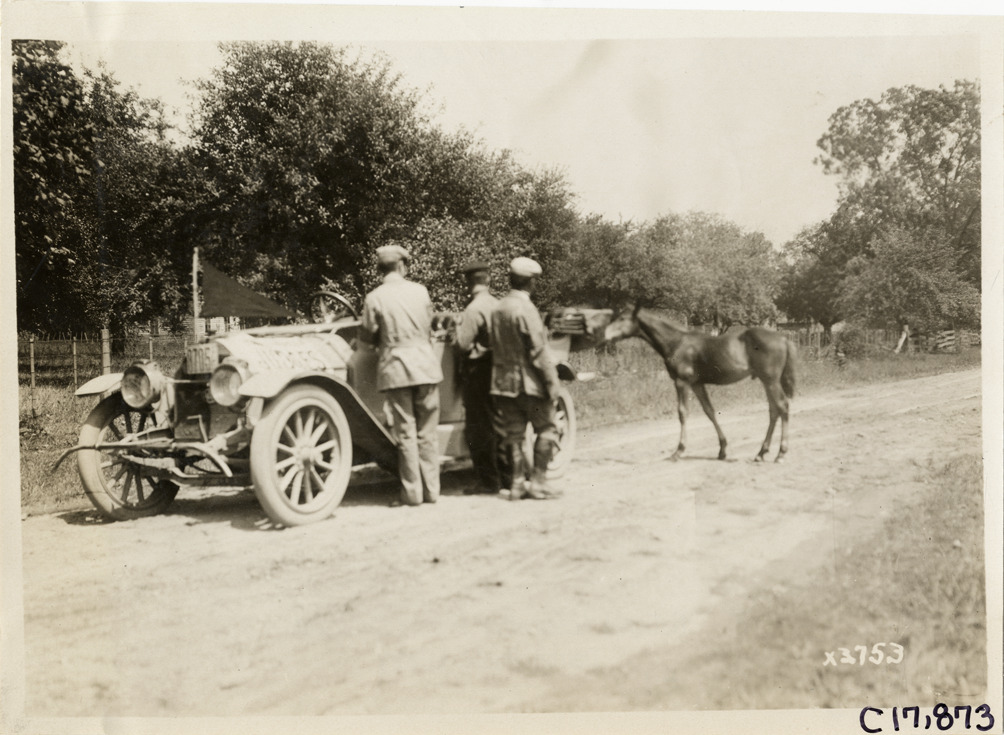 View of foal approaching motorists and car on rural roadside during the 1911 reliability contest sponsored by the Chicago Motor Club. Contestants traveled on routes through Illinois, Indiana, Kentucky, Ohio and Michigan. Stamped on back: "Spooner & Wells, Inc., photographers, 1231 Woodward Ave., Detroit, Mich., telephone North 1745." Handwritten on back: "Tours--Chicago Reliability Run, 1911."