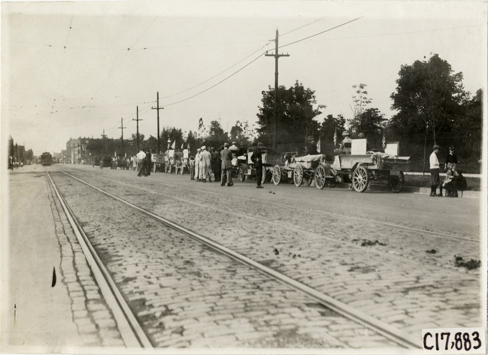 View of motorists with trucks parked on roadside during the 1911 reliability contest sponsored by the Chicago Motor Club. Contestants traveled on routes through Illinois, Indiana, Kentucky, Ohio and Michigan. Stamped on back: "Spooner & Wells, Inc., photographers, 1231 Woodward Ave., Detroit, Mich., telephone North 1745." Handwritten on back: "Tours--Chicago Reliability Run, 1911."