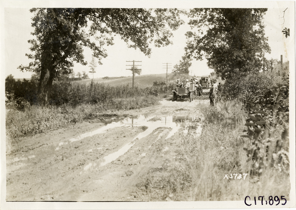 Trucks approaching standing water on rural road, 1911 Chicago Reliability Run