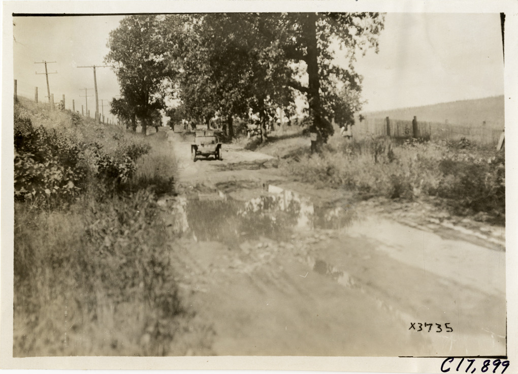 Rear view of trucks traveling on rural road during the 1911 reliability contest sponsored by the Chicago Motor Club. Standing water on road in foreground. Contestants traveled on routes through Illinois, Indiana, Kentucky, Ohio and Michigan. Stamped on back: "Spooner & Wells, Inc., photographers, 1231 Woodward Ave., Detroit, Mich., telephone North 1745." Handwritten on back: "Tours--Chicago Reliability Run, 1911."