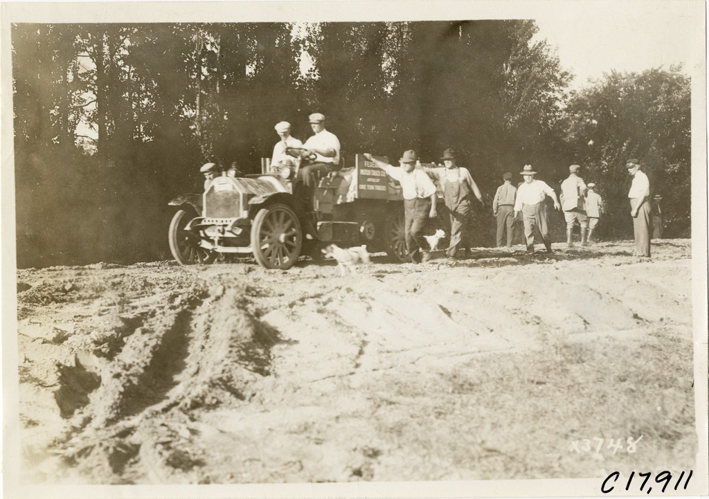 Men pushing Federal truck on rural road, 1911 Chicago Reliability Run