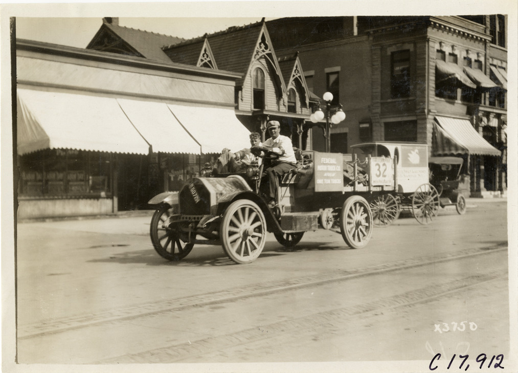View of driver and passenger in Federal truck during the 1911 reliability contest sponsored by the Chicago Motor Club. Contestants traveled on routes through Illinois, Indiana, Kentucky, Ohio and Michigan. Commercial buildings in background. Stamped on back: "Spooner & Wells, Inc., photographers, 1231 Woodward Ave., Detroit, Mich., telephone North 1745." Handwritten on back: "Tours--Chicago Reliability Run, 1911."