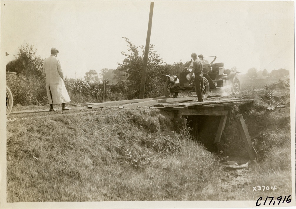 View of two men guiding car across wooden bridge over creek during 1911 reliability contest sponsored by the Chicago Motor Club. Two men attempt to guide tires of second car over bridge. Contestants traveled on routes through Illinois, Indiana, Kentucky, Ohio and Michigan. Stamped on back: "Spooner & Wells, Inc., photographers, 1231 Woodward Ave., Detroit, Mich., telephone North 1745." Handwritten on back: "Tours--Chicago Reliability Run, 1911."