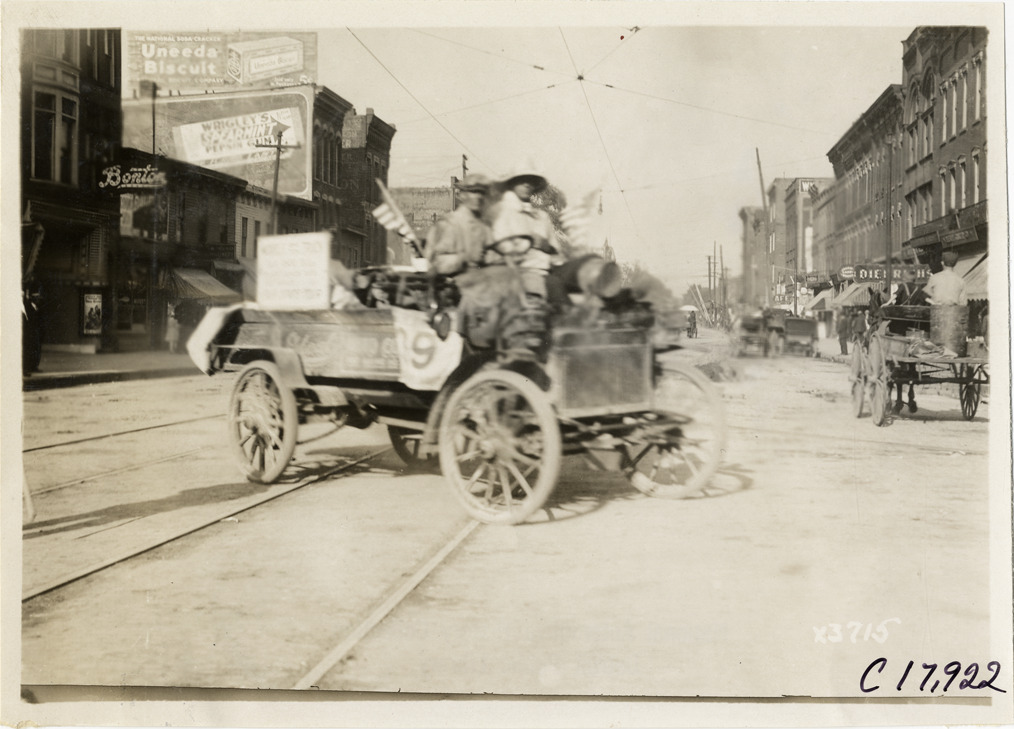 Motorists in truck crossing streetcar tracks at Jackson, Michigan, 1911 Chicago Reliability Run