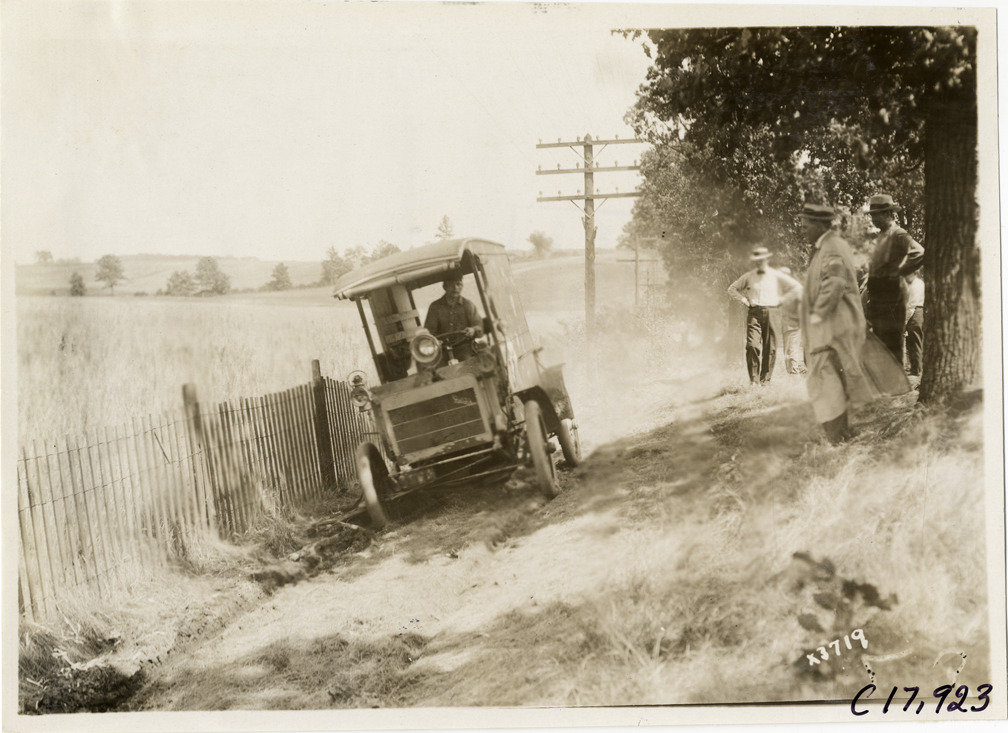 Driver in truck lodged on side of rural road, 1911 Chicago Reliability Run