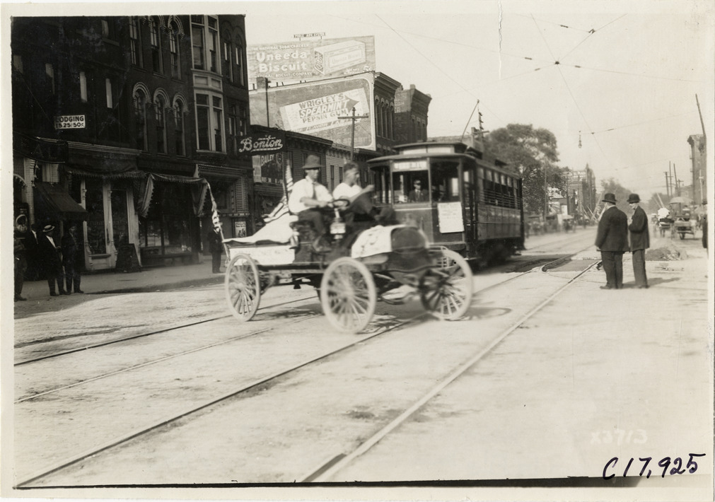 View of driver and passenger in Chase truck no. 33 crossing tracks in front of streetcar in Jackson, Michigan during the 1911 reliability contest sponsored by the Chicago Motor Club. Contestants traveled on routes through Illinois, Indiana, Kentucky, Ohio and Michigan. Commercial buildings in background. Stamped on back: "Spooner & Wells, Inc., photographers, 1231 Woodward Ave., Detroit, Mich., telephone North 1745." Handwritten on back: "#33 Chase entering Jackson. Tours--Chicago Reliability Run, 1911."