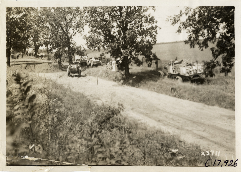 View of Mais trucks parked on side of rural road during the 1911 reliability contest sponsored by the Chicago Motor Club. Contestants traveled on routes through Illinois, Indiana, Kentucky, Ohio and Michigan. Stamped on back: "Spooner & Wells, Inc., photographers, 1231 Woodward Ave., Detroit, Mich., telephone North 1745." Handwritten on back: "Tours--Chicago Reliability Run, 1911."