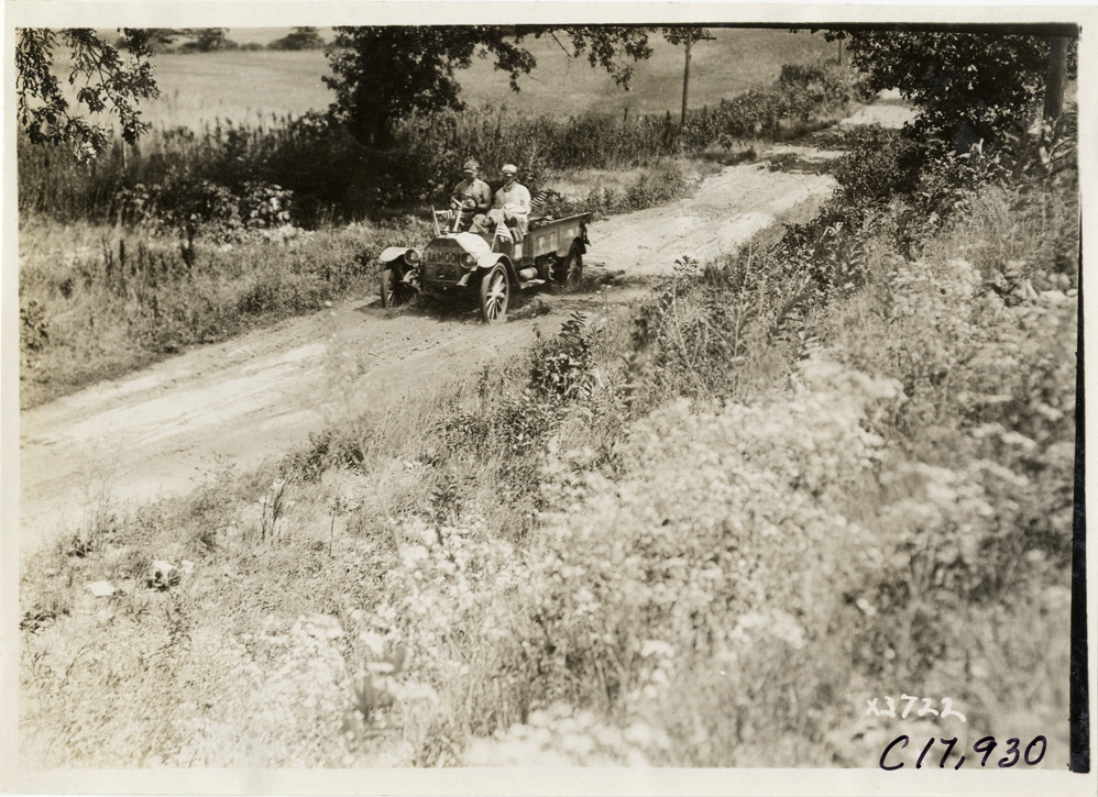 Motorists in Le Moon truck approaching standing water on rural road, 1911 Chicago Reliability Run