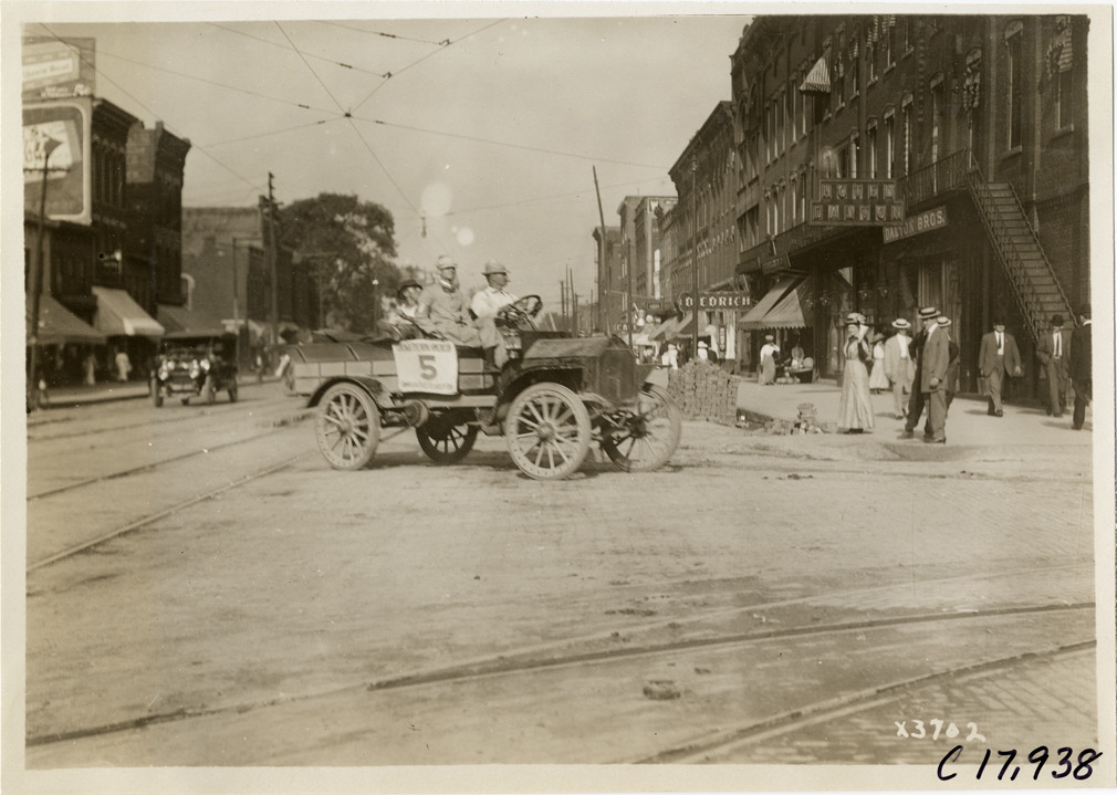 View of driver and passenger in truck no. 3 crossing streetcar tracks in Jackson, Michigan during the 1911 reliability contest sponsored by the Chicago Motor Club. Contestants traveled on routes through Illinois, Indiana, Kentucky, Ohio and Michigan. Commercial buildings in background. Stamped on back: "Spooner & Wells, Inc., photographers, 1231 Woodward Ave., Detroit, Mich., telephone North 1745." Handwritten on back: "Tours--Chicago Reliability Run, 1911."