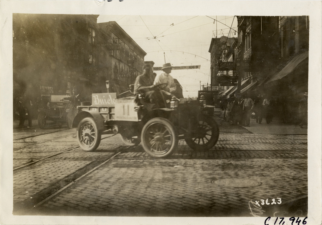 View of driver and passenger in Buick truck no. 11 crossing streetcar tracks in Jackson, Michigan during the 1911 reliability contest sponsored by the Chicago Motor Club. Contestants traveled on routes through Illinois, Indiana, Kentucky, Ohio and Michigan. Commercial buildings in background. Stamped on back: "Spooner & Wells, Inc., photographers, 1231 Woodward Ave., Detroit, Mich., telephone North 1745." Handwritten on back: "Tours--Chicago Reliability Run, 1911."