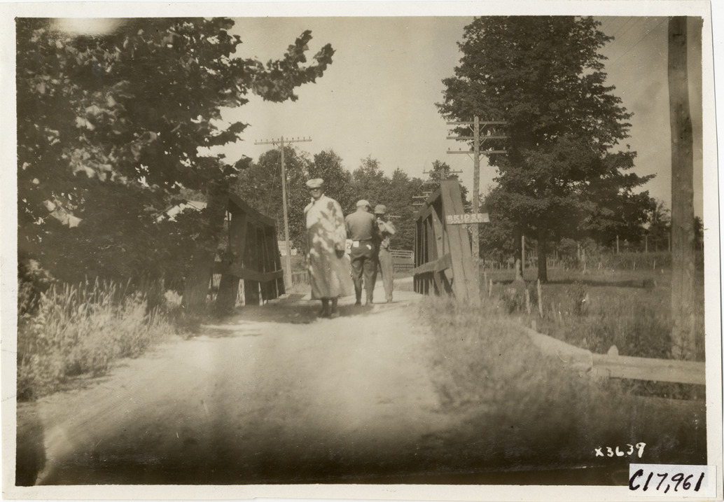 View of referee N.H. Van Sicklen and pilot of Chalmers car examining bridge in Indiana during the 1911 reliability contest sponsored by the Chicago Motor Club. "Bridge not safe" sign is displayed on bridge. Contestants traveled on routes through Illinois, Indiana, Kentucky, Ohio and Michigan. Stamped on back: "Spooner & Wells, Inc., photographers, 1231 Woodward Ave., Detroit, Mich., telephone North 1745." Handwritten on back: "Referee Van Sicklen and Chalmers pilot [undecipherable] examine and condemn a bridge 17 miles from South Bend, Ind. Tours--Chicago Reliability Run, 1911."