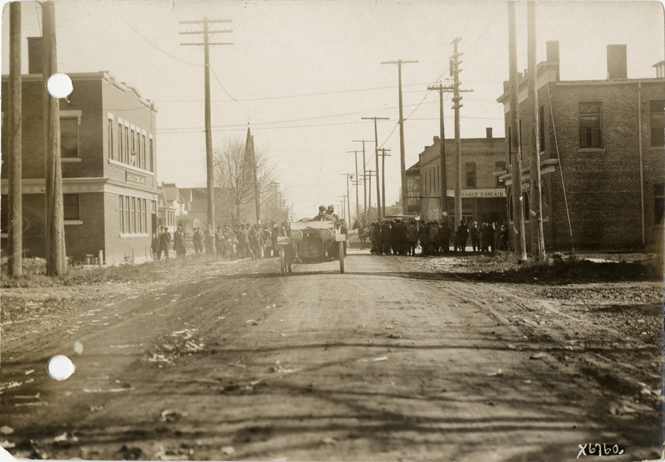 View of crowd looking at R.C.H. press car in middle of street at Scottville, Michigan during the 1912 reliability contest sponsored by the Chicago Motor Club. Contestants circled Lake Michigan, passing through Illinois, Wisconsin, Michigan and Indiana. Stamped on back: "Spooner & Wells, Inc., photographers, 1231 Woodward Ave., Detroit, Mich., telephone North 1745." Handwritten on back: "Interested crowds in Scotville [sic]. R.C.H. press car center of interest, Chicago Reliability Run, 1912. Tours--Chicago Reliability Run, 1912."