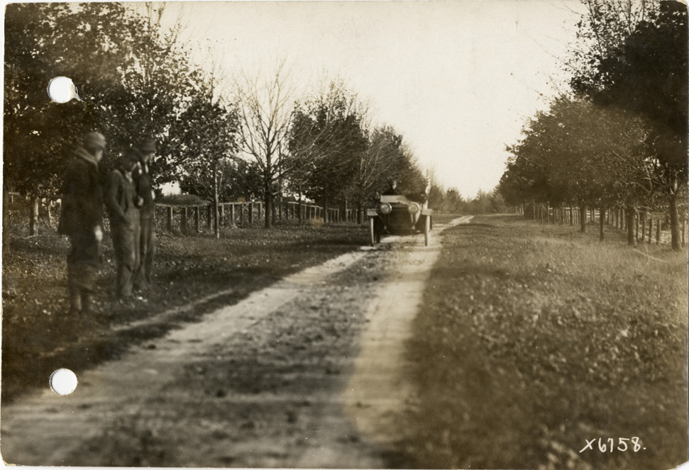 View of driver in car traveling on rural road near Norwood, Michigan during the 1912 reliability contest sponsored by the Chicago Motor Club. Contestants circled Lake Michigan, passing through Illinois, Wisconsin, Michigan and Indiana. Three men stand on roadside. Stamped on back: "Spooner & Wells, Inc., photographers, 1231 Woodward Ave., Detroit, Mich., telephone North 1745." Handwritten on back: "Splendid Michigan roads near Norwood, Chicago Reliability Run, 1912. Tours--Chicago Reliability Run, 1912."