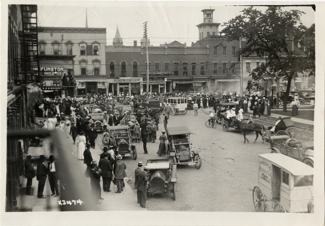 View of cars, horse-drawn wagons and pedestrians on street during the 1911 three-day reliability contest sponsored by the Cleveland News. Contestants followed routes through Ohio and West Virginia. Handwritten on back: "Tours--Cleveland Reliability Run, 1911."