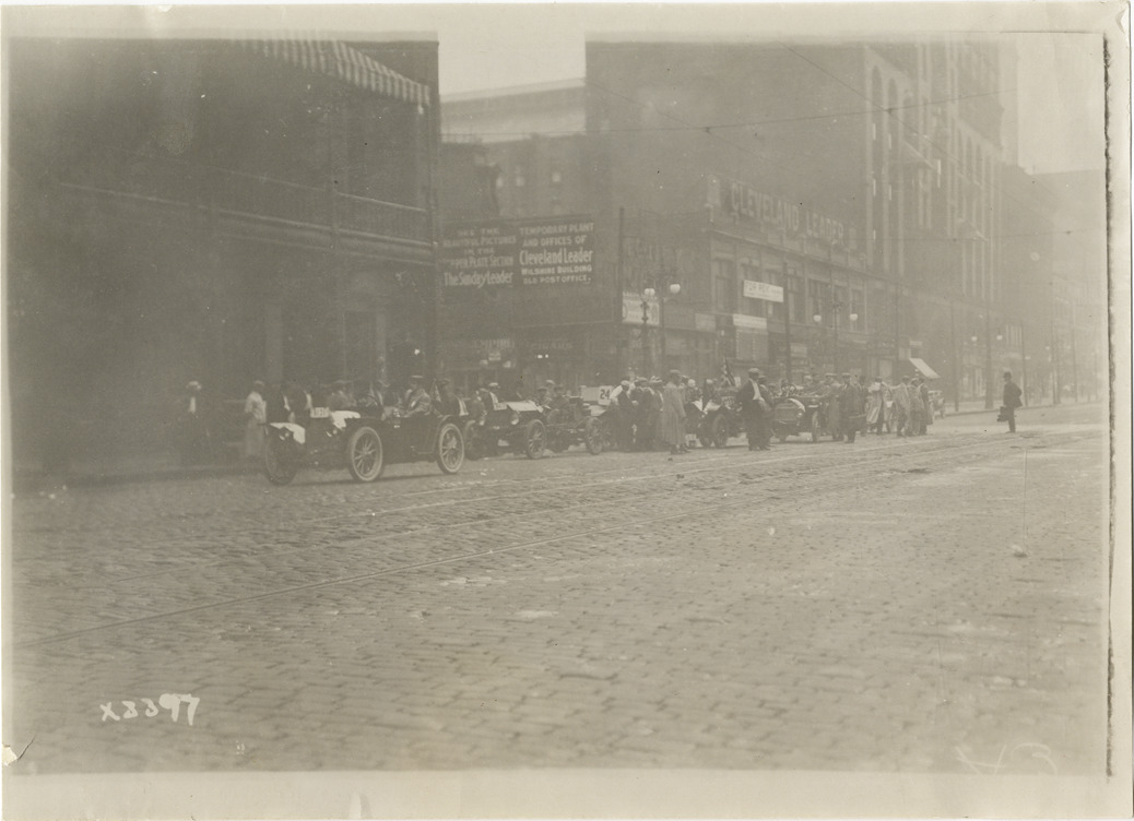 View of cars parked in front of the offices for the Cleveland Leader during the 1911 three-day reliability contest sponsored by the Cleveland News. Contestants followed routes through Ohio and West Virginia. Handwritten on back: "Tours--Cleveland Reliability Run, 1911."