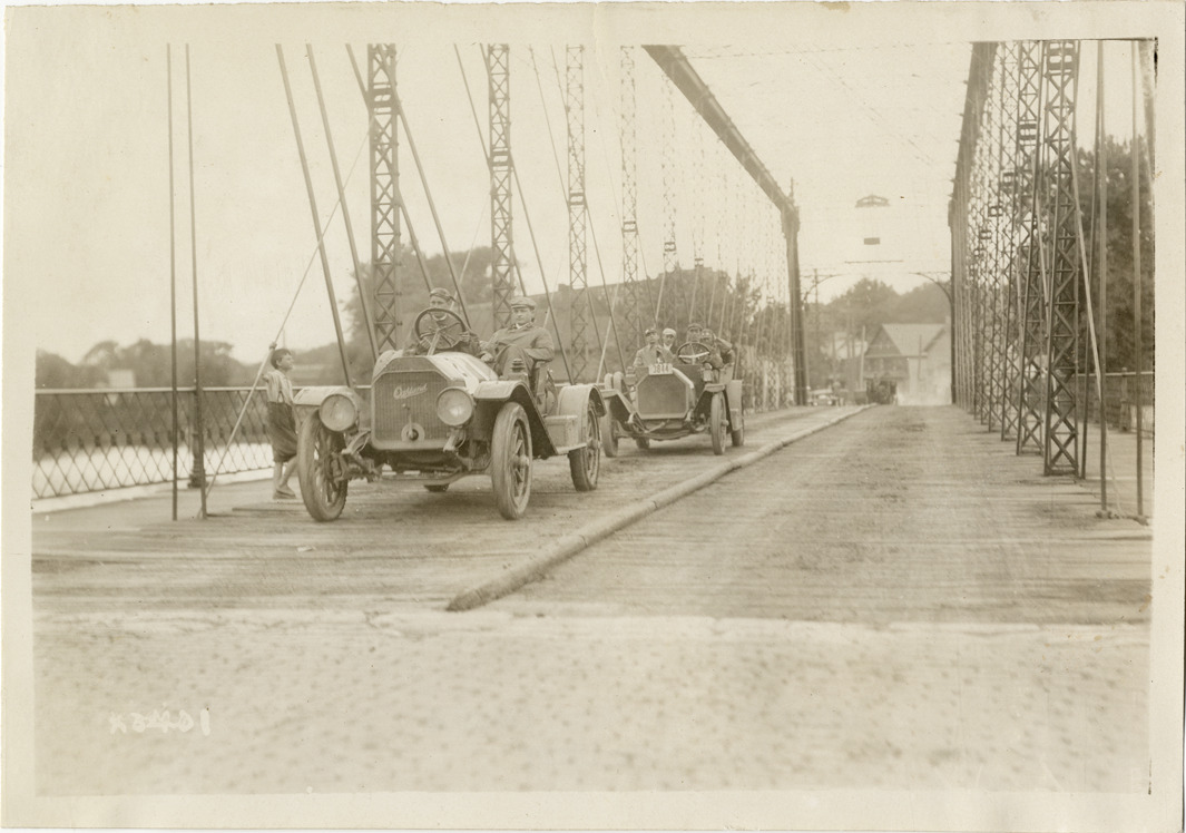 View of driver and passenger in Oakland car, followed by another car, crossing bridge during the 1911 three-day reliability contest sponsored by the Cleveland News. Young boy stands on side of bridge. Contestants followed routes through Ohio and West Virginia. Stamped on back: "Spooner & Wells, Inc., photographers, 1231 Woodward Ave., Detroit, Mich., telephone North 1745." Handwritten on back: "Tours--Cleveland Reliability Run, 1911."