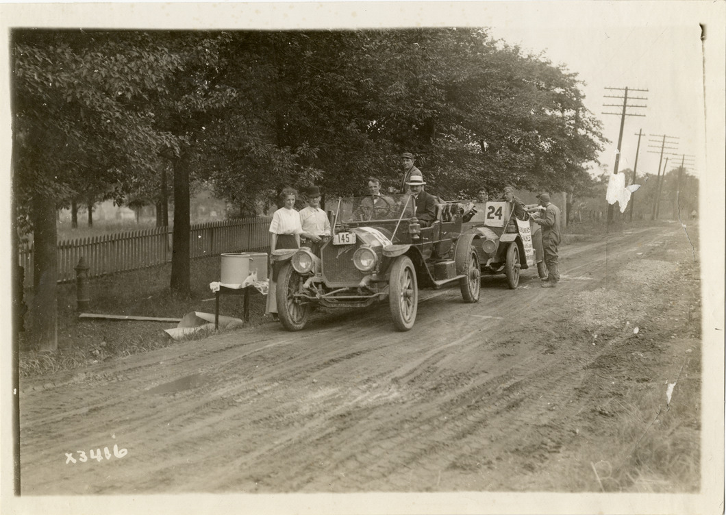 View of motorists with Mitchell car no. 34 and Chalmers press car no. 24 parked on roadside during the 1911 three-day reliability contest sponsored by the Cleveland News. Man and woman stand next to two buckets on table. Contestants followed routes through Ohio and West Virginia. Handwritten on back: "Tours--Cleveland Reliability Run, 1911."
