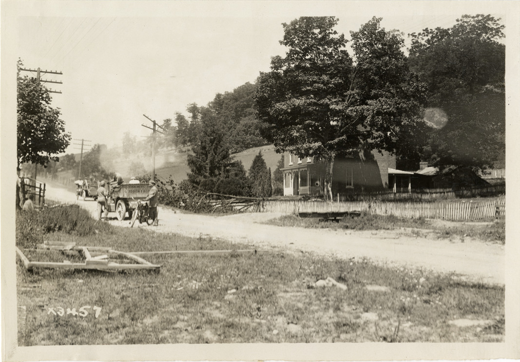 Rear view of motorists with Chalmers "30" press car and man with motorcycle on side of rural road during the 1911 three-day reliability contest sponsored by the Cleveland News. Contestants followed routes through Ohio and West Virginia. Sign on back of car reads: "Chalmers 30, winner of Glidden trophy, 1910 Annual Reliability Tour." House behind trees on right. Stamped on back: "Spooner & Wells, Inc., photographers, 1231 Woodward Ave., Detroit, Mich., telephone North 1745." Handwritten on back: "Tours--Cleveland Reliability Run, 1911."
