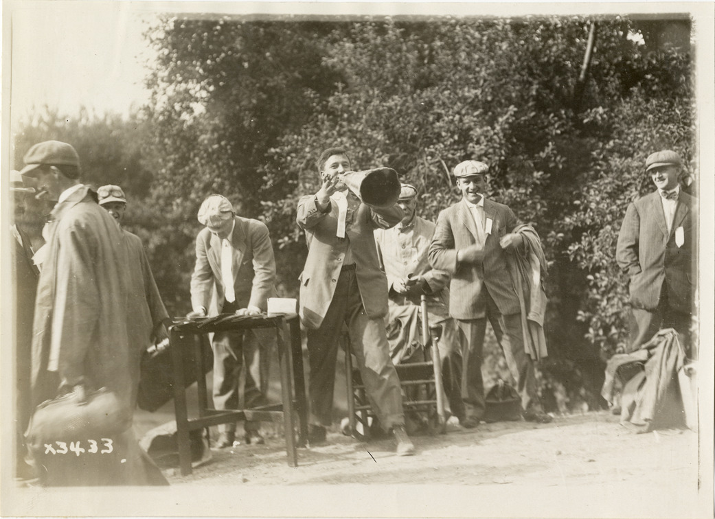 View of officials with table, chairs and megaphone on roadside during the 1911 three-day reliability contest sponsored by the Cleveland News. Contestants followed routes through Ohio and West Virginia. Handwritten on back: "Tours--Cleveland Reliability Run, 1911."