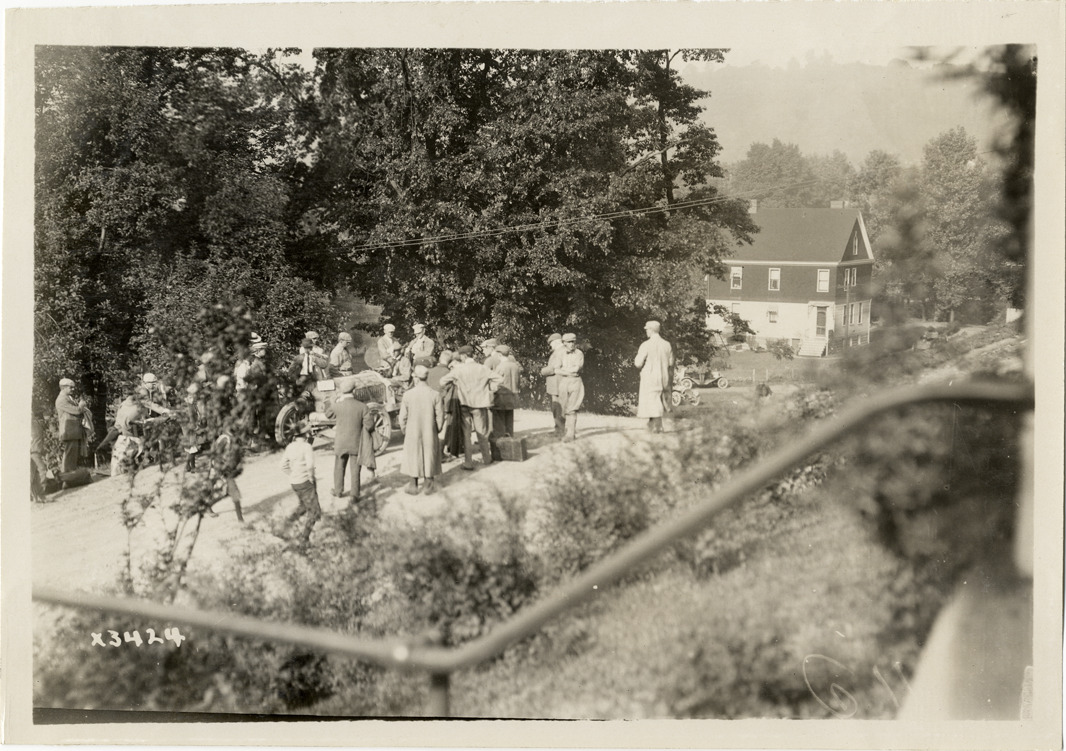 View of officials and onlookers surrounding driver in car during the 1911 three-day reliability contest sponsored by the Cleveland News. House in background. Contestants followed routes through Ohio and West Virginia. Stamped on back: "Spooner & Wells, Inc., photographers, 1231 Woodward Ave., Detroit, Mich., telephone North 1745." Handwritten on back: "Tours--Cleveland Reliability Run, 1911."
