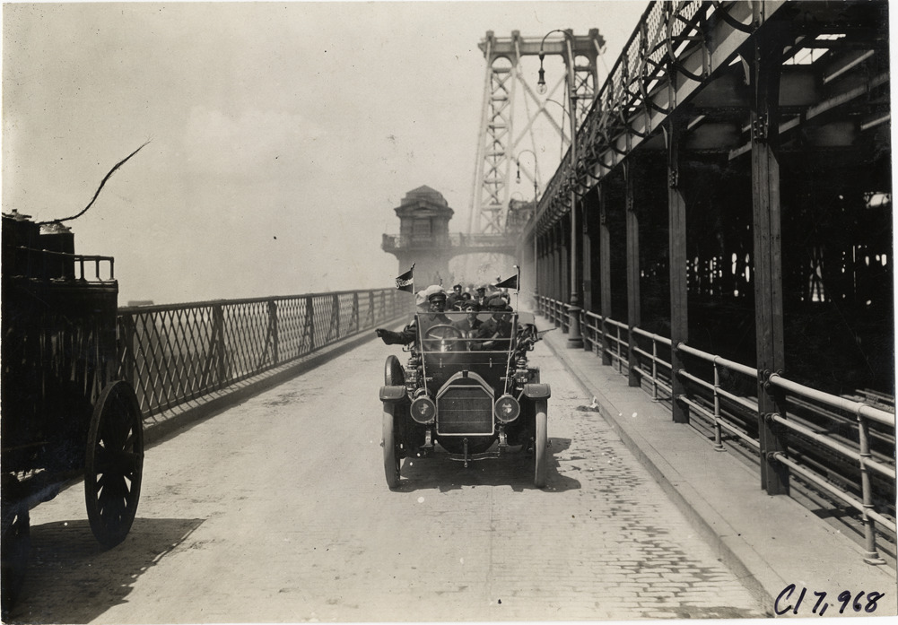View of Stearns automobile caravan crossing the Williamsburg Bridge, during the 1909 Crippled Children's Outing sponsored by Wyckoff, Church & Partridge. Owners of Stearns cars loaned their vehicles to transport children of the Free Industrial School for Crippled Children to Coney Island and the Crescent Athletic Club. Stamped on back: "Spooner & Wells, Inc., photographers, telephones 3472-3473 Columbus, 1931 Broadway, New York." Handwritten on back: "Tours--Crippled Children's Outing, New York, 1909."