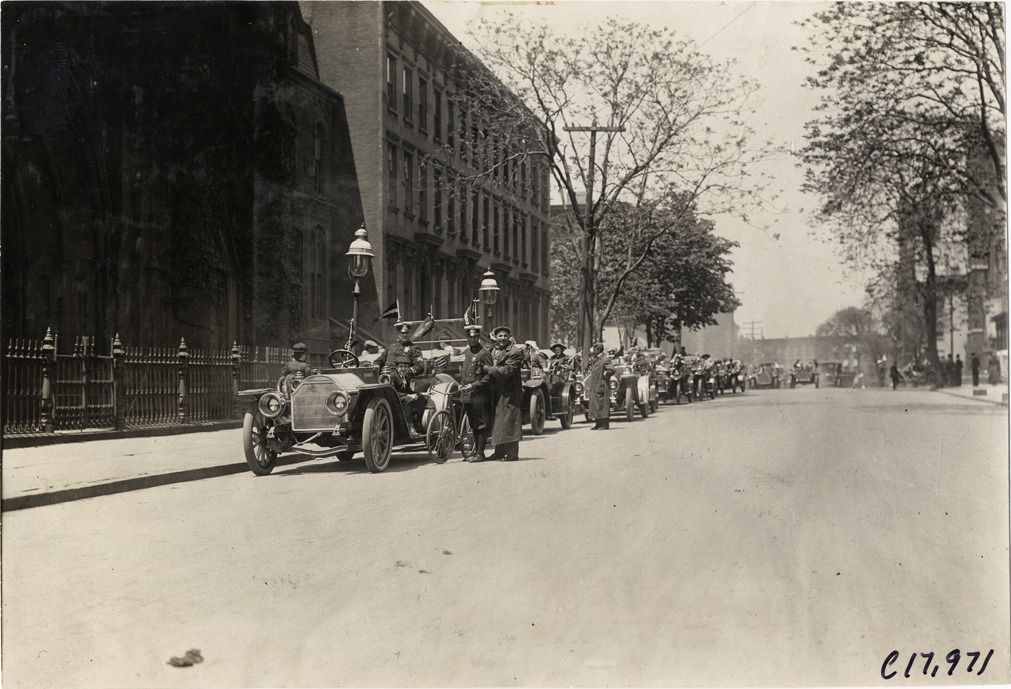 View of motorists in Stearns cars lined up in street during the 1909 Crippled Children's Outing sponsored by Wyckoff, Church & Partridge. Owners of Stearns cars loaned their vehicles to transport children of the Free Industrial School for Crippled Children to Coney Island and the Crescent Athletic Club. Stamped on back: "Spooner & Wells, Inc., photographers, telephones 3472-3473 Columbus, 1931 Broadway, New York." Handwritten on back: "Tours--Crippled Children's Outing, New York, 1909."