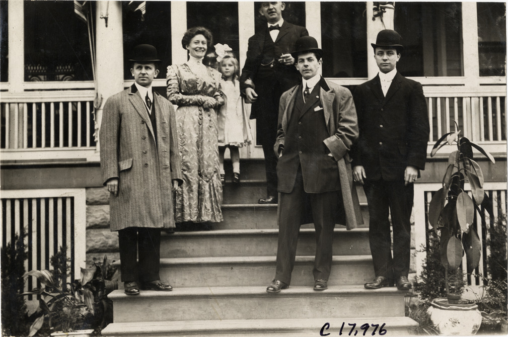 Men, woman and girl posing on porch, 1909 Crippled Children's Outing