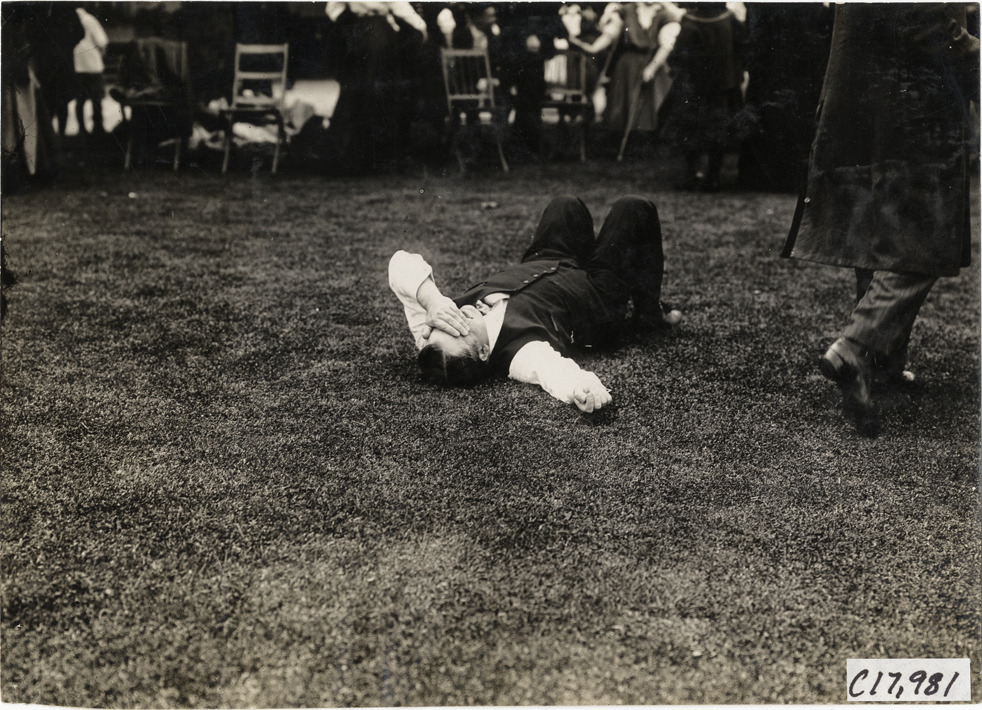 View of man reclining on ground, with his hand covering his eyes, during the 1909 Crippled Children's Outing sponsored by Wyckoff, Church & Partridge. Owners of Stearns cars loaned their vehicles to transport children of the Free Industrial School for Crippled Children to Coney Island and the Crescent Athletic Club. Stamped on back: "Spooner & Wells, Inc., photographers, telephones 3472-3473 Columbus, 1931 Broadway, New York." Handwritten on back: "Tours--Crippled Children's Outing, New York, 1909."