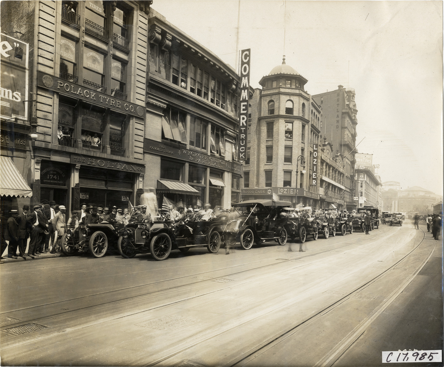 View of motorists in Stearns cars lined up on street in front of Lozier Motor Cars and Wyckoff, Church & Partridge Stearns dealership, during the 1911 Crippled Children's Outing sponsored by Wyckoff, Church & Partridge. Owners of Stearns cars loaned their vehicles to transport children of the Free Industrial School for Crippled Children to Coney Island and the Crescent Athletic Club. Stamped on back: "Spooner & Wells, Inc., photographers, telephones 3472-3473 Columbus, 1931 Broadway, New York." Handwritten on back: "Tours--Crippled Children's Outing, New York, 1911."