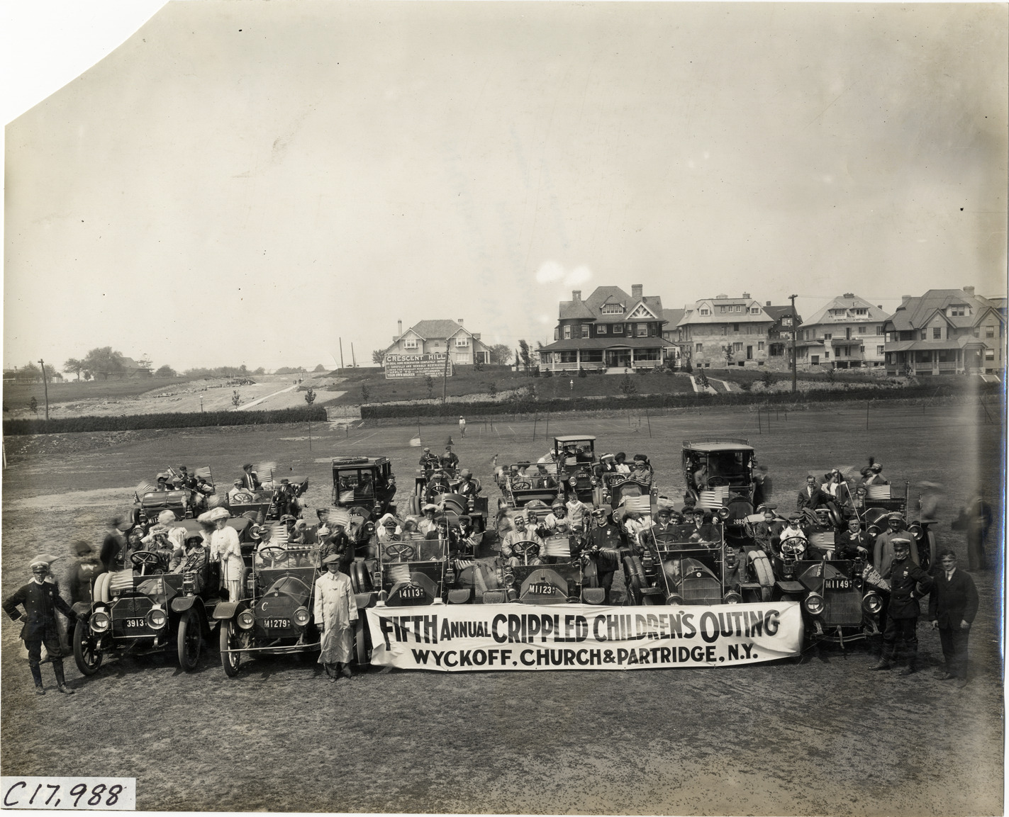 View of motorists and children posing in Stearns cars in field during the 1911 Crippled Children's Outing sponsored by Wyckoff, Church & Partridge. Banner displayed in front of group reads: "Fifth Annual Crippled Children's Outing, Wyckoff, Church & Partridge, N.Y." Houses in background. Owners of Stearns cars loaned their vehicles to transport children of the Free Industrial School for Crippled Children to Coney Island and the Crescent Athletic Club. Stamped on back: "Spooner & Wells, Inc., photographers, telephones 3472-3473 Columbus, 1931 Broadway, New York." Handwritten on back: "Tours--Crippled Children's Outing, New York, 1911."