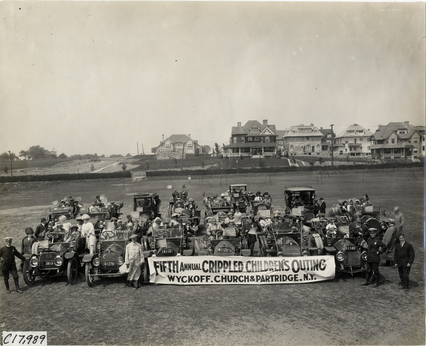 View of motorists and children posing in Stearns cars in field during the 1911 Crippled Children's Outing sponsored by Wyckoff, Church & Partridge. Banner displayed in front of group reads: "Fifth Annual Crippled Children's Outing, Wyckoff, Church & Partridge, N.Y." Houses in background. Owners of Stearns cars loaned their vehicles to transport children of the Free Industrial School for Crippled Children to Coney Island and the Crescent Athletic Club. Stamped on back: "Spooner & Wells, Inc., photographers, telephones 3472-3473 Columbus, 1931 Broadway, New York." Handwritten on back: "Tours--Crippled Children's Outing, New York, 1911."