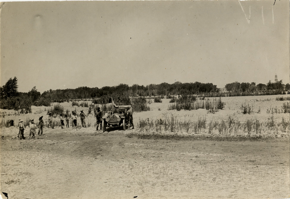 Chalmers-Detroit pathfinder automobile next to San Pablo River, Flag-to-Flag Endurance Run from Denver to Mexico City