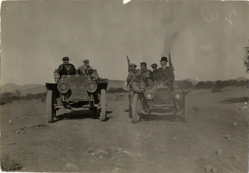 View of motorists in Chalmers-Detroit "30" pathfinder car and unidentified car near Chihuahua, Mexico, during the Flag-to-Flag Endurance Run from Denver to Mexico City. Stamped on back: "Spooner & Wells, Inc., photographers, telephones 3472-3473 Columbus, 1931 Broadway, New York." Handwritten on back: "Newkirk party out of [undecipherable] to Chihuahua. Tours--Denver to Mexico City Endurance Run (Chalmers)."