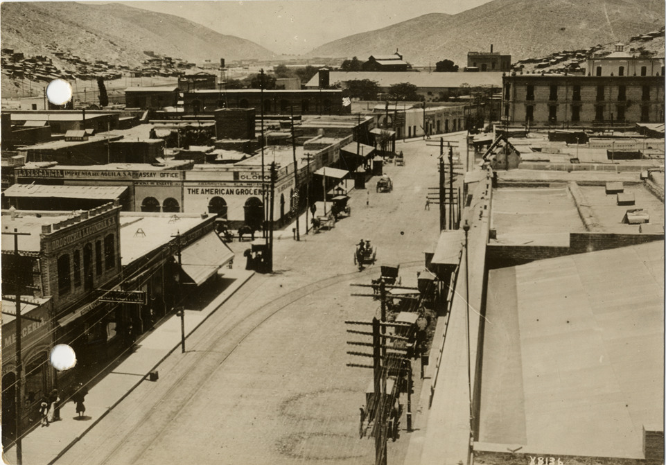 Bird's-eye view of Avenida Hidalgo in Torreon, Mexico, during the Flag-to-Flag Endurance Run from Denver to Mexico City. Stamped on back: "Spooner & Wells, Inc., photographers, 1231 Woodward Ave., Detroit, Mich." Handwritten on back: "A birdseye view of Torreon, looking east along Avenida Hidalgo, the principal street of the city. The large building in the background is the Hotel Salvador. Courtesy of Chalmers Motor Co. Tours--Denver to Mexico City Endurance Run (Chalmers)."