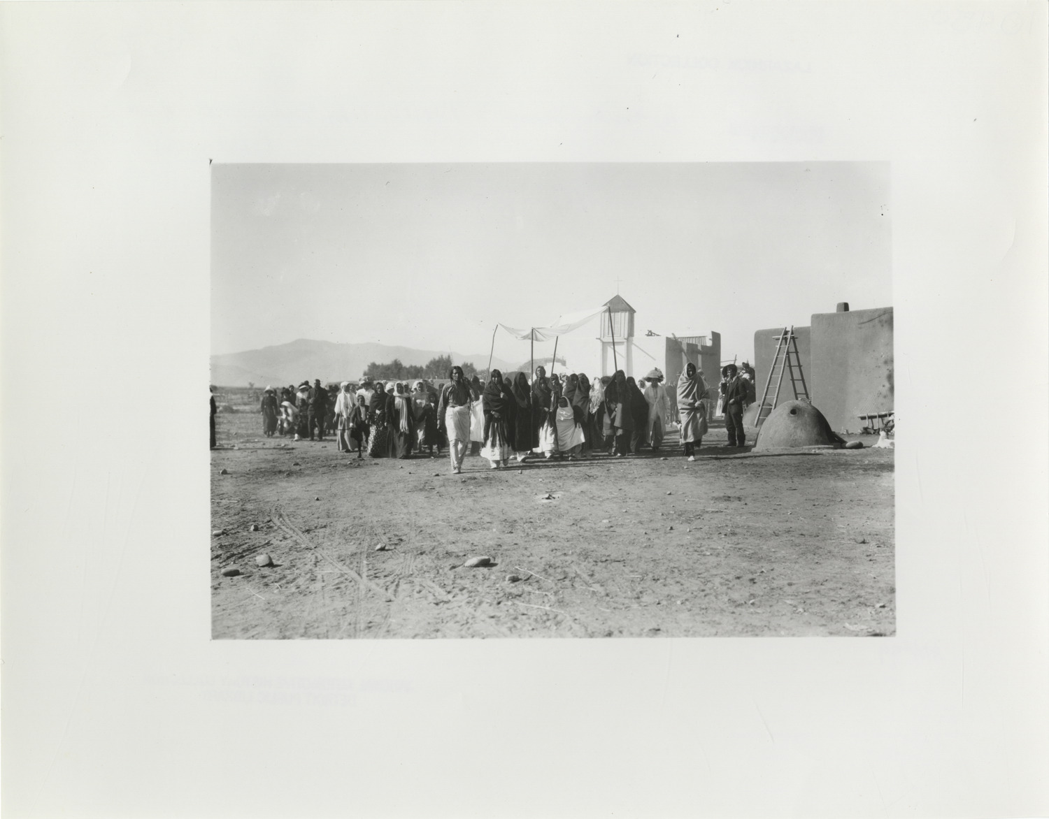 View of crowd standing in front of pueblo in Mexico or southwestern United States during the Flag-to-Flag Endurance Run from Denver to Mexico City. Handwritten on back: "Tours--Denver to Mexico City Endurance Run (Chalmers)."